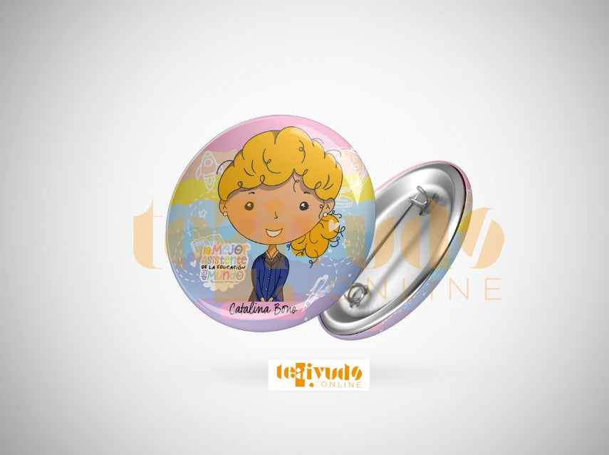 Kit digital Chapitas Profesora 2025 estilo Scolaria. Incluye 42 PNG listos para estampar en chapitas de 58 mm con área segura de 68 mm.