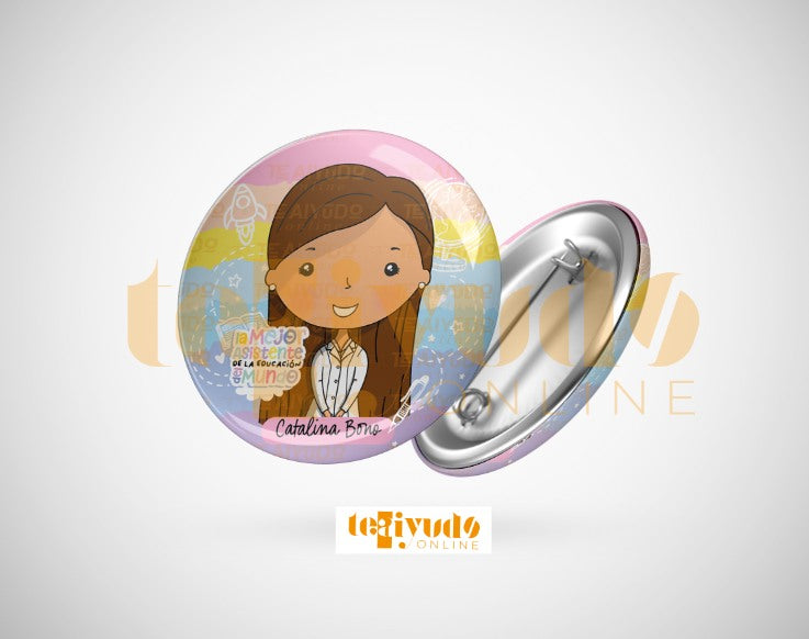 Kit digital Chapitas Profesora 2025 estilo Scolaria. Incluye 42 PNG listos para estampar en chapitas de 58 mm con área segura de 68 mm.
