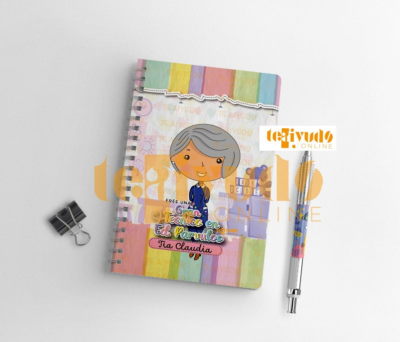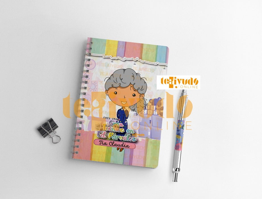 Kit digital con 42 portadas Mujer Técnico en Educación Parvularia. Avatares variados, contraportada, hoja de guarda y texto PNG. Alta calidad 300 PPP.