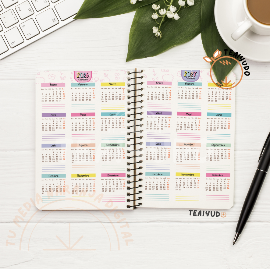 Incluye un calendario para cada año, con un formato práctico y listo para imprimir, pensado para mantener la organización al día mientras conservas la coherencia en tu diseño.