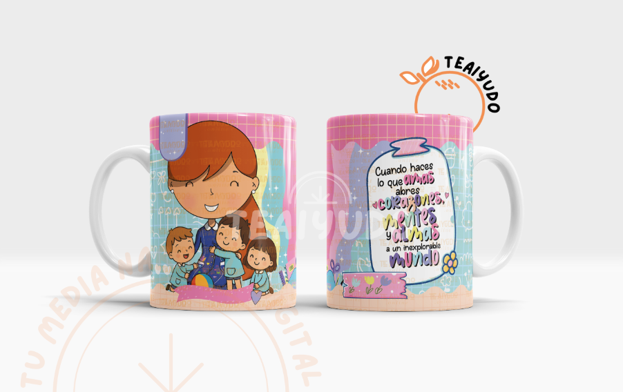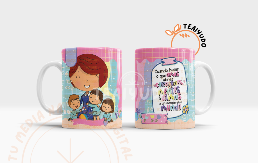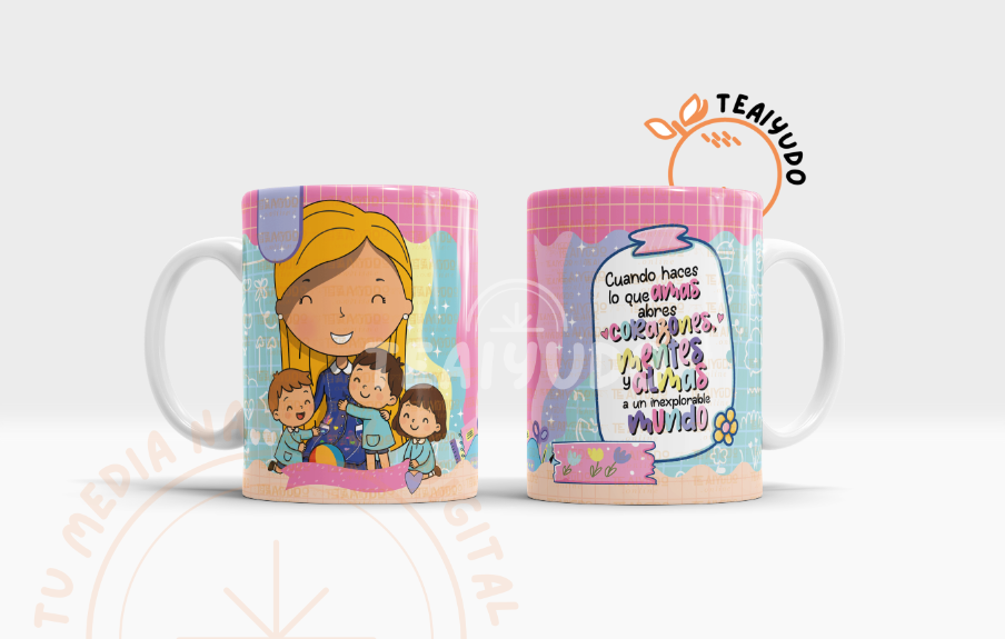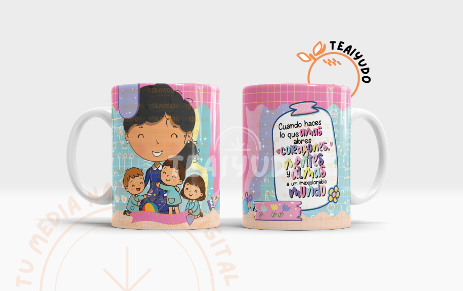 Tazones con diseño Splashy Avatar para educadora de párvulo con niños. Incluyen 42 avatares, cliparts de texto y mockups en PNG alta calidad para sublimación y regalos.